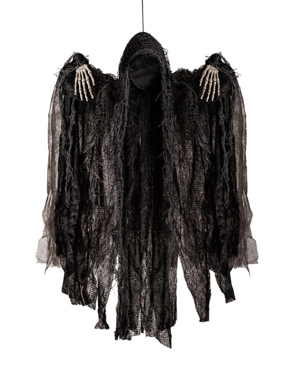 Der gesichtslose Dämon sorgt für Unruhe auf deiner Horror Party. Unser schwarzes Gespenst ohne Gesicht ist eine Hängefigur für Halloween & Geisterbahn. Der Fetzengeist kommt als unheimliche Hängedeko und schwebt über den Köpfen deiner Gäste. Lass sein schwarzes Fetzenkleid im Wind wehen oder wehe es mit einem Ventilator an. So hauchst du der Kreatur mehr Leben ein. Zwei knochige Hände ragen unter dem Fetzenkleid hervor und lassen sich beliebig biegen. Ein Muss für Halloween Freaks!